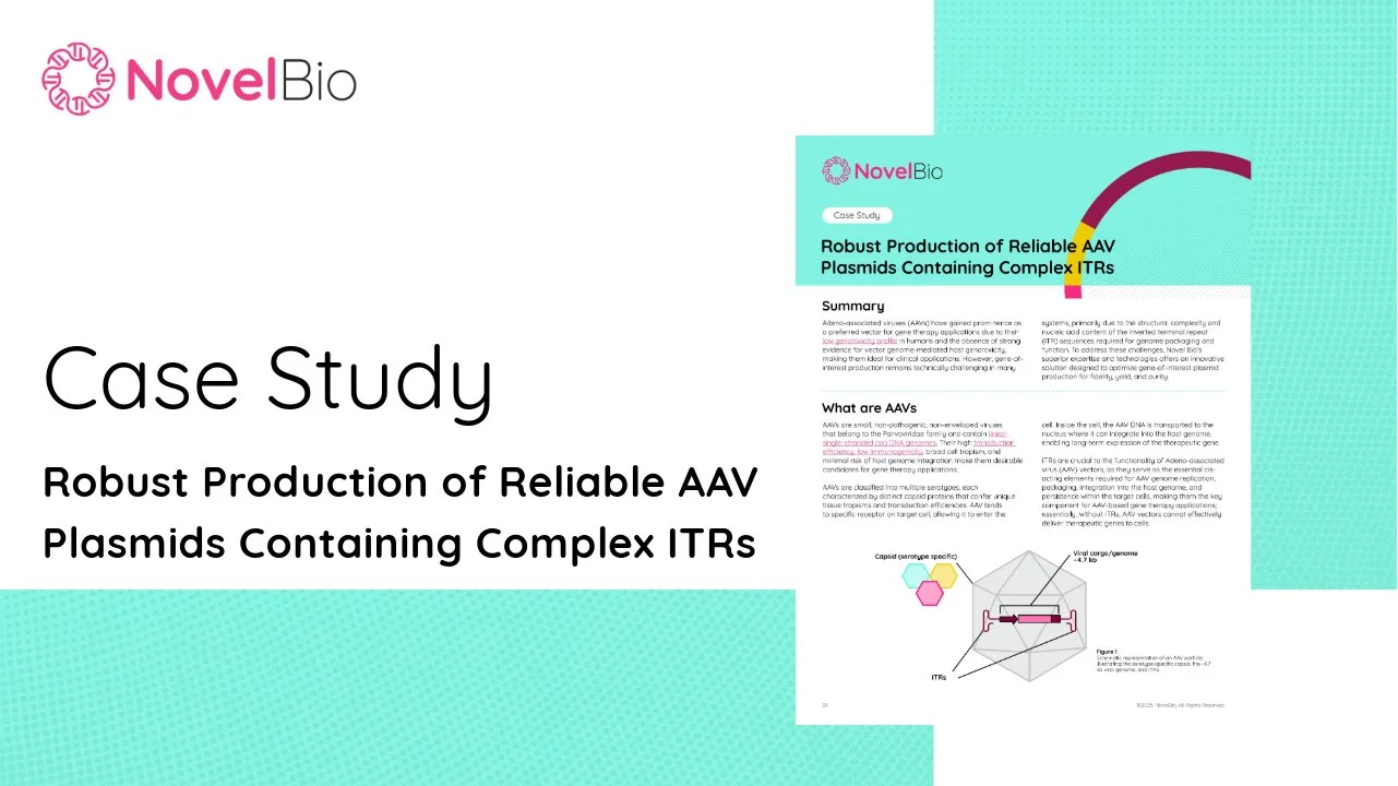 At Novel Bio, we bring extensive expertise in cloning and producing AAV gene-of interest plasmids, including complex ITR engineering projects and traditional AAV manufacturing workflows